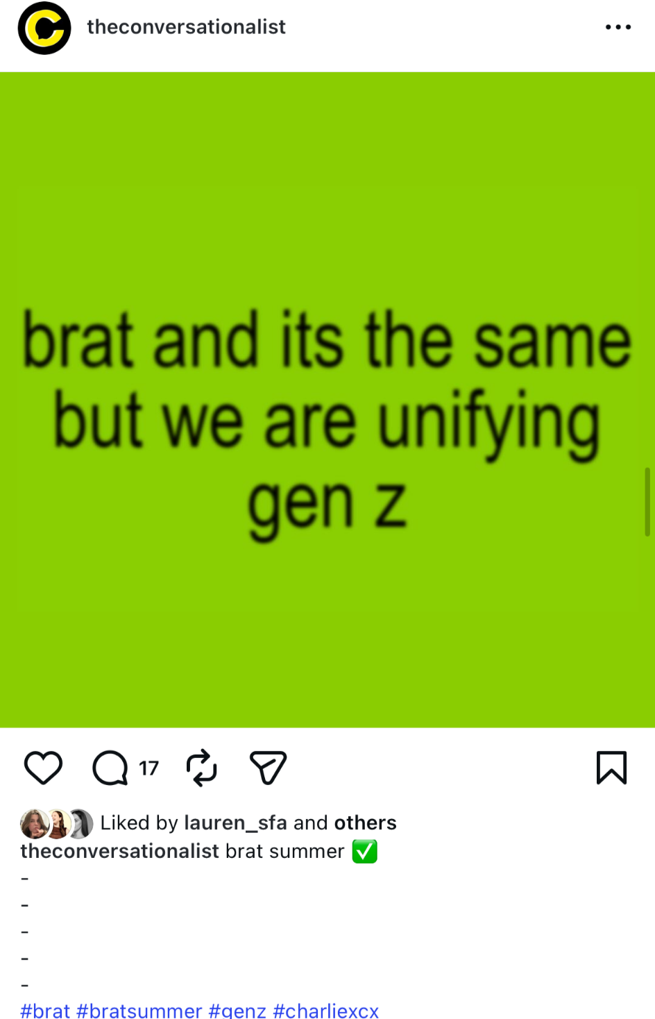 During my time as a Social Media and Engagement Intern at The Conversationalist, I supported the team in managing and growing their social media presence - particularly on Instagram. Toward the end of my internship, my main project entailed creating a comprehensive presentation deck for the team, leveraging insights from our social media analytics to guide ideas for our future social planning.